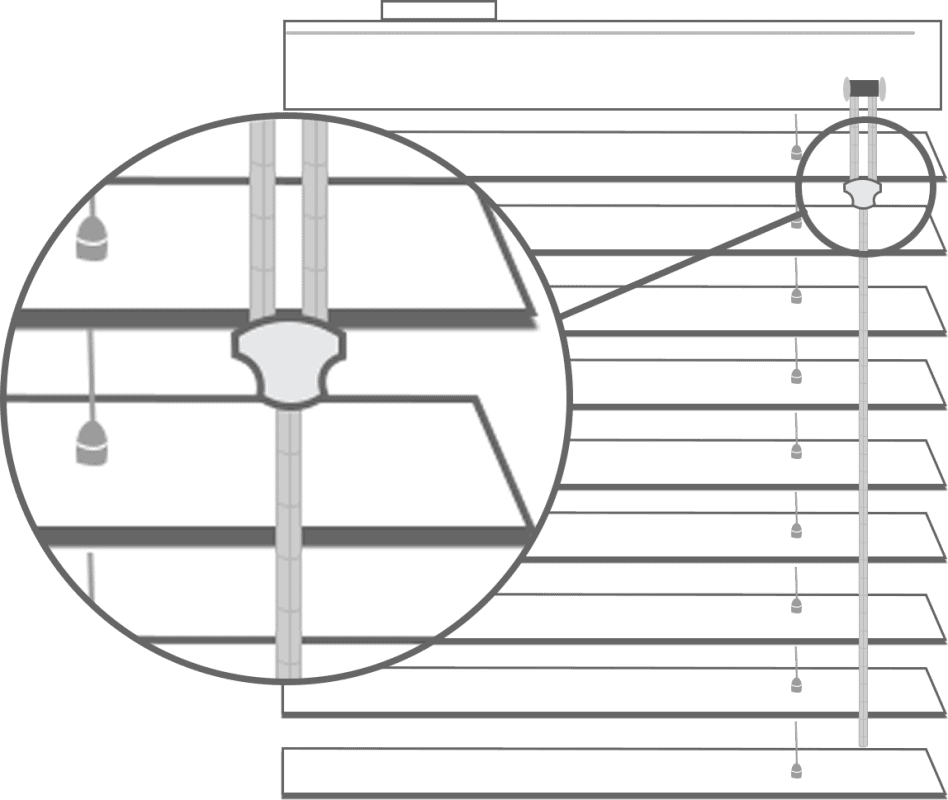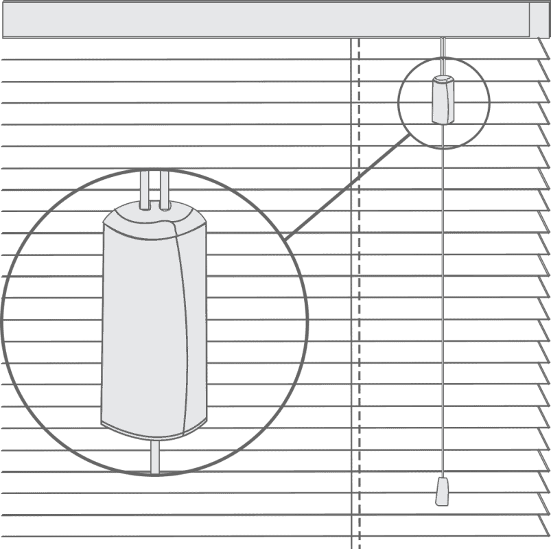 A breakaway cord condenser is pre-fitted to the lift cords so that when a horizontal force is applied to the cords above the condenser, it safely breaks away, eliminating any hazardous loops.