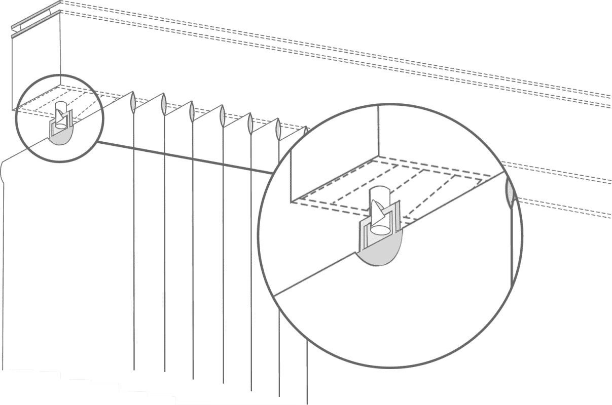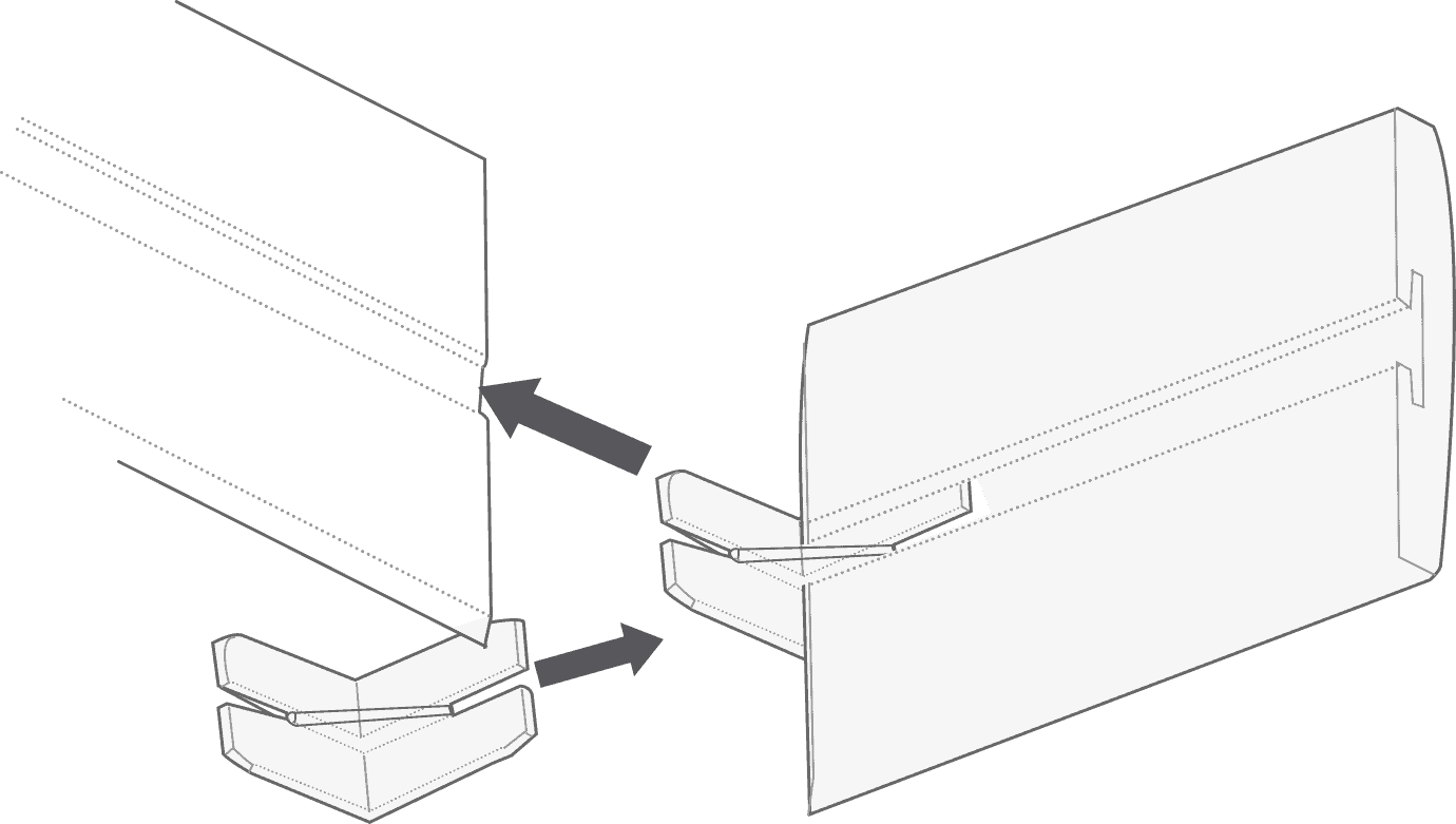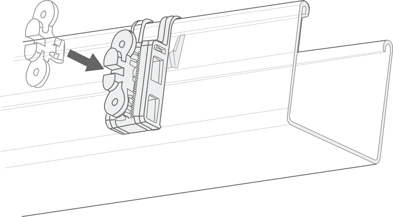 Attach the winged clips to the rear of the pelmet and hook the serrated pelmet clips onto the headrail (if installing the blind within a recess, this should be done before step 2) so that both the serrated clips and winged clips are in corresponding postions on the headrail and pelmet. Then align the two clips with each other and apply gentle pressure to the front of the pelmet, directly over the clips to click them together.